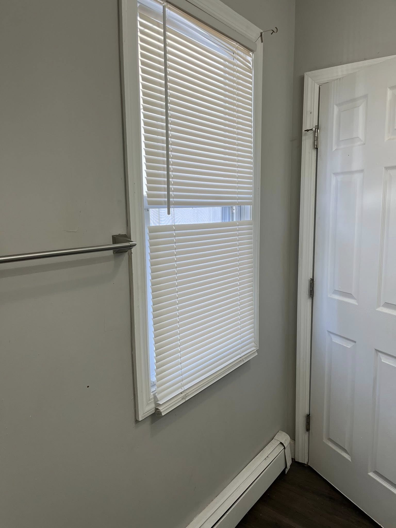 Stepping inside, you are greeted by gleaming dark hardwood-style flooring that runs throughout the unit, providing a sophisticated contrast to the freshly painted neutral gray walls and crisp white trim. The modern kitchen features sleek white cabinetry and functional appliances, designed for those who actually enjoy cooking at home.
