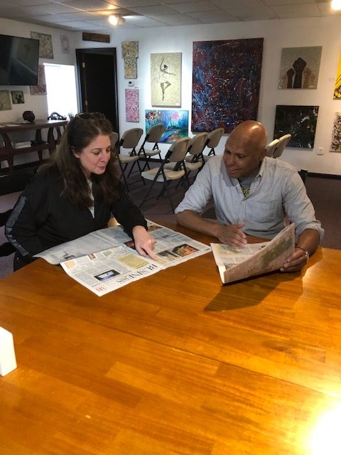 Vanessa Fuhrmans, Deputy management bureau chief at The Wall Street Journal and Troy McMullen, Executive editor at ABC News sitting in Connecticut Real Estate reading recent articles on our art galleries.