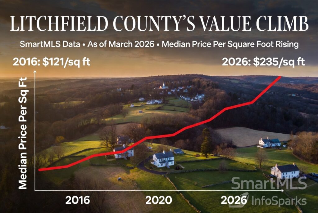 The Story in a Single Red Line In the shadow of the Berkshire foothills, where stone walls wind through pastures that have fed families since before the Revolution, a single red line on the SmartMLS dashboard tells a powerful story about home values in Litchfield County. This chart tracks the median price per square foot for the entire county over rolling 12-month periods. As of March 6, 2026, the line has climbed from $121 per square foot in 2016 to $235 per square foot today — a near doubling in value per foot that is quietly redefining what a home is worth in these hills.